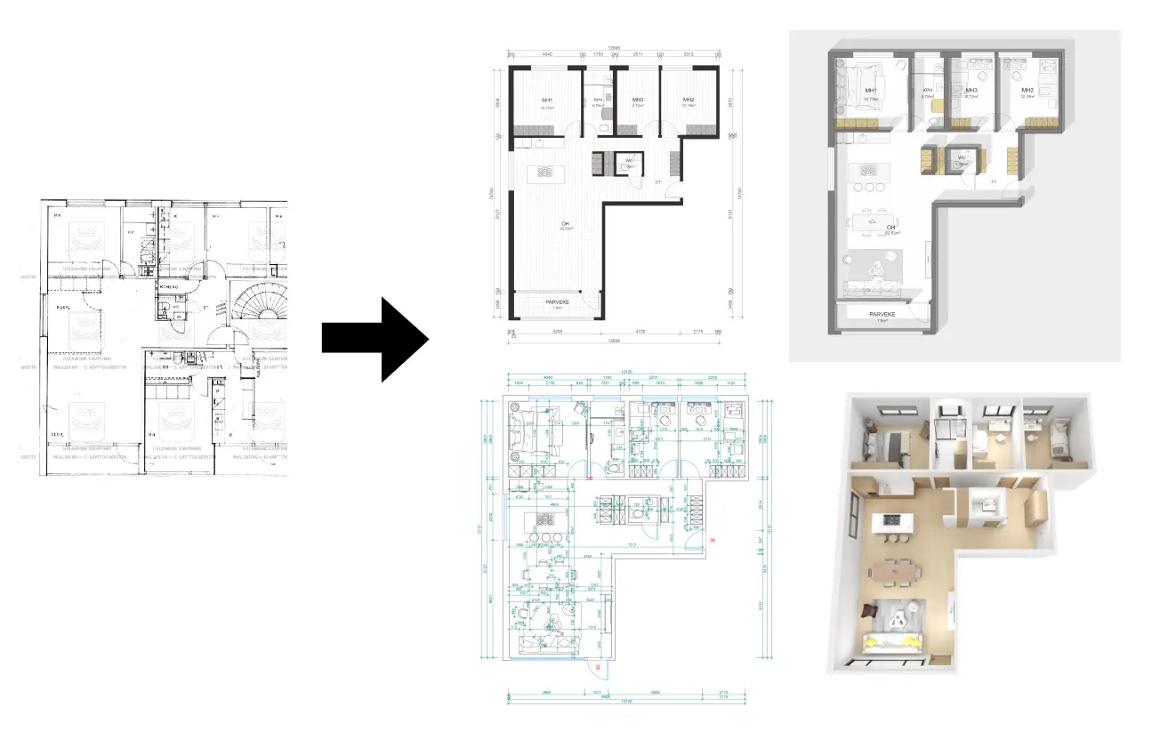 Premium renovation planning services, including comprehensive drafting stage space planning, immersive photorealistic 3D -visualizations and tours, architectural drawings, detailed material specifications, and full design oversight to transform your space from initial concept through final completion.You can start with a free floor plan evaluation, and if your layout is suitable, you’ll receive a fixed-price quote