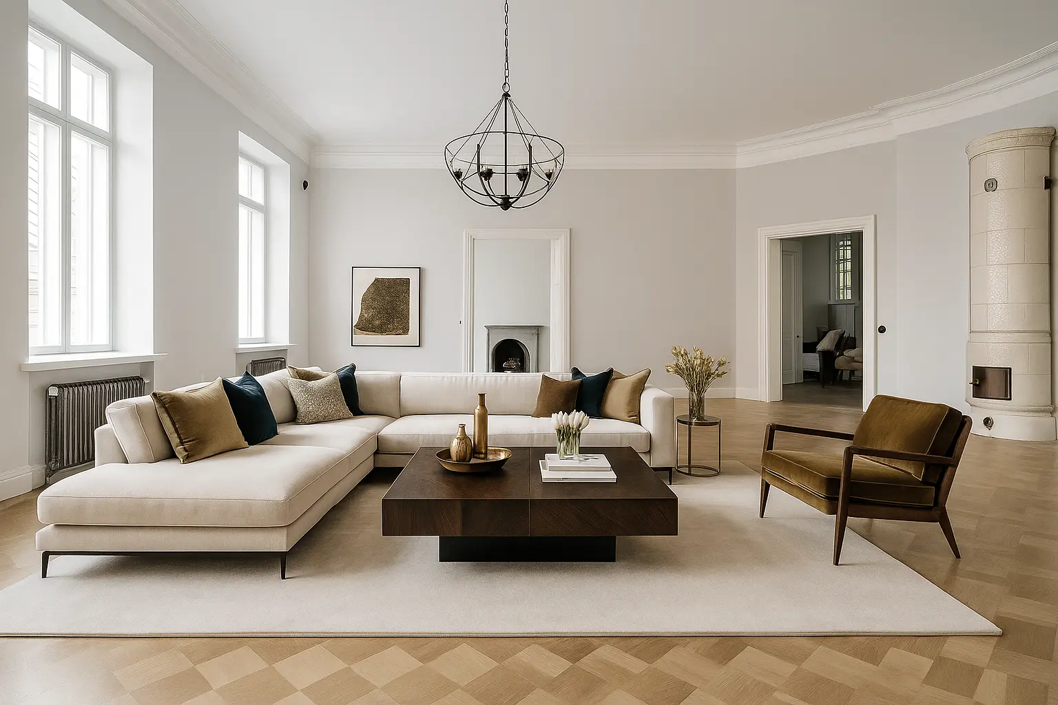This old city apartment doubled its usable space by connecting the basement through a new staircase and relocating the kitchen. The virtual tour shows the complete transformation – from material choices to room proportions – revealing how historic charm meets contemporary functionality.